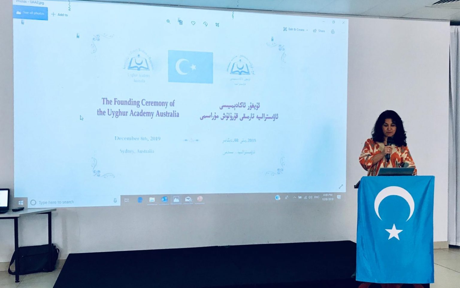 Seçimden sonra yapılan Avustralya Uygur Akademisi açılış töreninde önce Doğu Türkistan İstiklal marşı ve Avustralya Milli marşı okundu. Daha sonra Uygur Akademisini merkezi yönetim kuruluna temsilen Amerika Uygur Akademisi genel sekreteri ve Uygur hareketi müdürü Roşen Abbas Hanım açılış konuşması yaptı ve Uygur Akademisi’nin on senedir yapmış olduğu çalışmalarını katılımcılara anlattı.